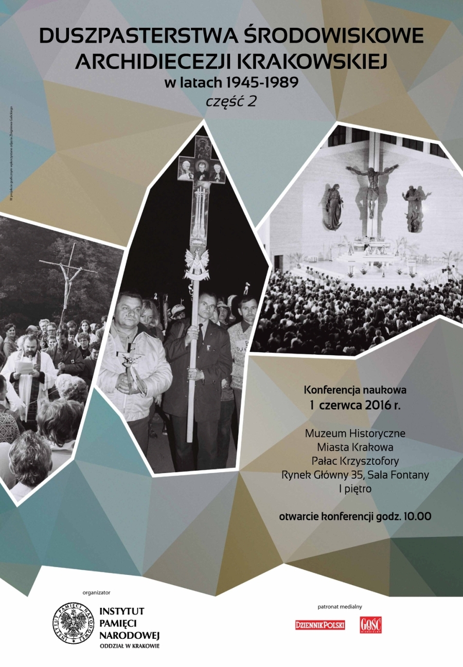 Oddział Instytutu Pamięci Narodowej w Krakowie zaprasza w dniu 1 czerwca 2016 r. na konferencję „Duszpasterstwa środowiskowe archidiecezji krakowskiej w latach 1945–1989, cz. 2”, która odbędzie się w Sali Fontany Muzeum Historycznego Miasta Krakowa przy Rynku Głównym 35.