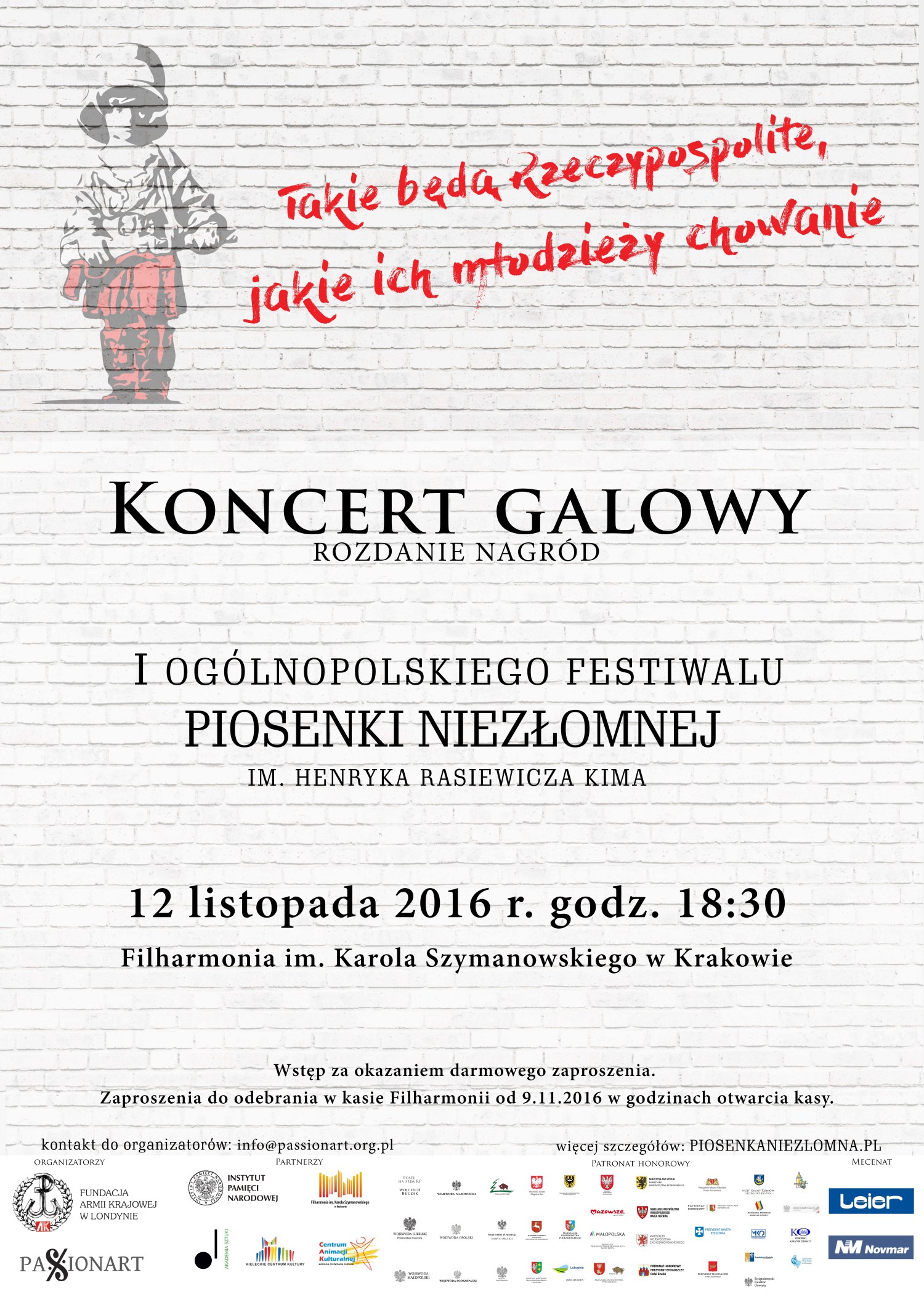 Podczas Koncertu Galowego, który będzie miał miejsce 12 listopada o godz. 18.30 w gmachu Filharmonii Krakowskiej wystąpią wyłonieni drogą kilku wojewódzkich eliminacji młodzi pasjonaci muzyki i patriotyzmu. Wcześniej, w godzinach przedpołudniowych będą trwać w tym samym miejscu przesłuchania finałowe, które wyłonią ogłoszonych wieczorem zwycięzców w poszczególnych kategoriach (soliści, zespoły, chóry) oraz zdobywcę Grand Prix Festiwalu, której fundatorem jest Zarząd Fundacji Armii Krajowej w Londynie.