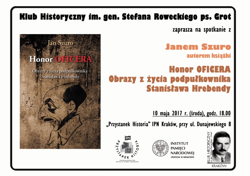 Krakowski Klub Historyczny im. gen. Stefana Roweckiego ps. Grot zaprasza na kolejne spotkanie. Gościem klubu będzie Jan Szuro – miłośnik Krakowa i jego dziejów, członek Towarzystwa Strzeleckiego Bractwo Kurkowe w Krakowie, autor książki „Honor oficera Obrazy z życia podpułkownika Stanisława Hrebendy”. W rozmowie z Małgorzatą Janiec opowie o podpułkowniku Stanisławie Hrebendzie odznaczonym m.in. odznaką „Orląt Lwowskich” oraz Orderem Virtuti Militari V klasy.
