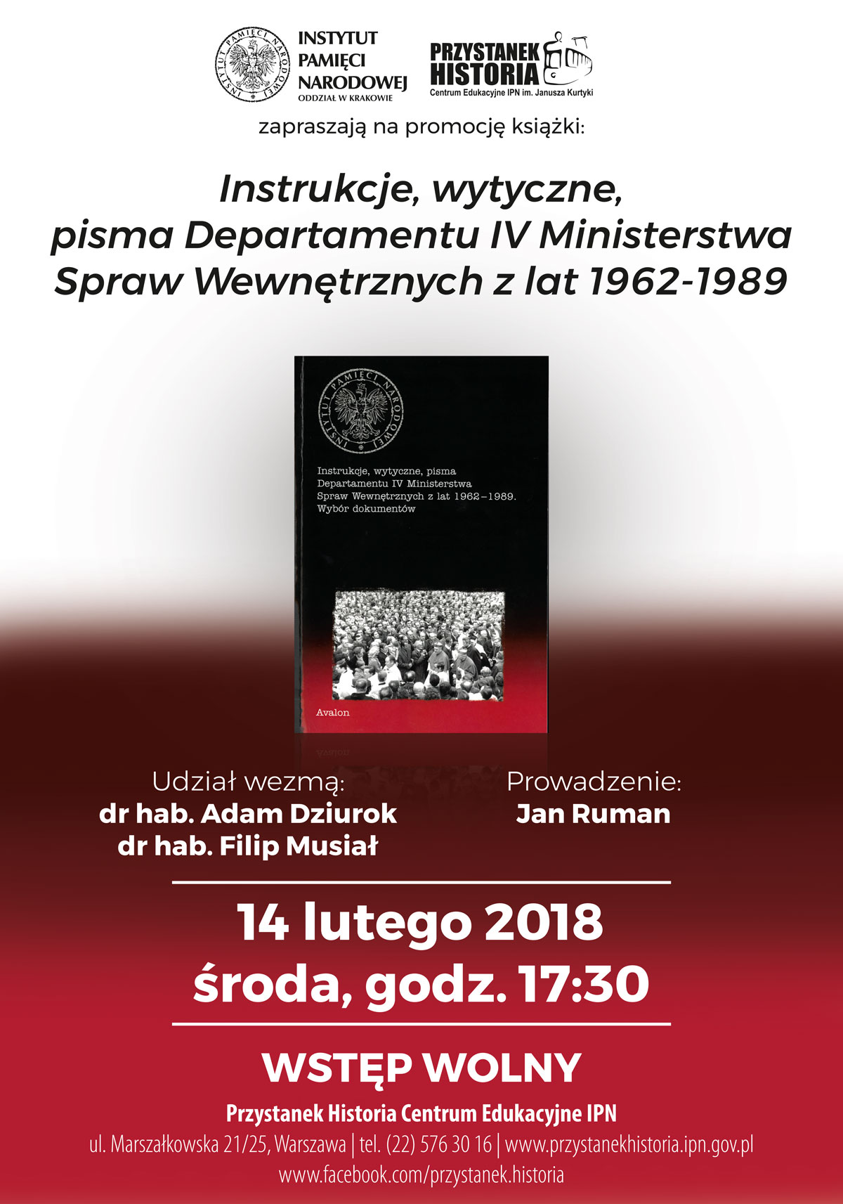 W Centrum Edukacyjnym „Przystanek Historia” IPN w Warszawie (ul. Marszałkowska 21/25) odbędzie się 14 lutego (godz. 17.30) promocja książki „Instrukcje, wytyczne, pisma Departamentu IV Ministerstwa Spraw Wewnętrznych z lat 1962-1989”, opublikowanej przez krakowski oddział IPN. Rozmowę z dr. hab. Filipem Musiałem i dr. Adamem Dziurokiem, redaktorami tomu, poprowadzi Jan Ruman, redaktor naczelny „Biuletynu IPN”.