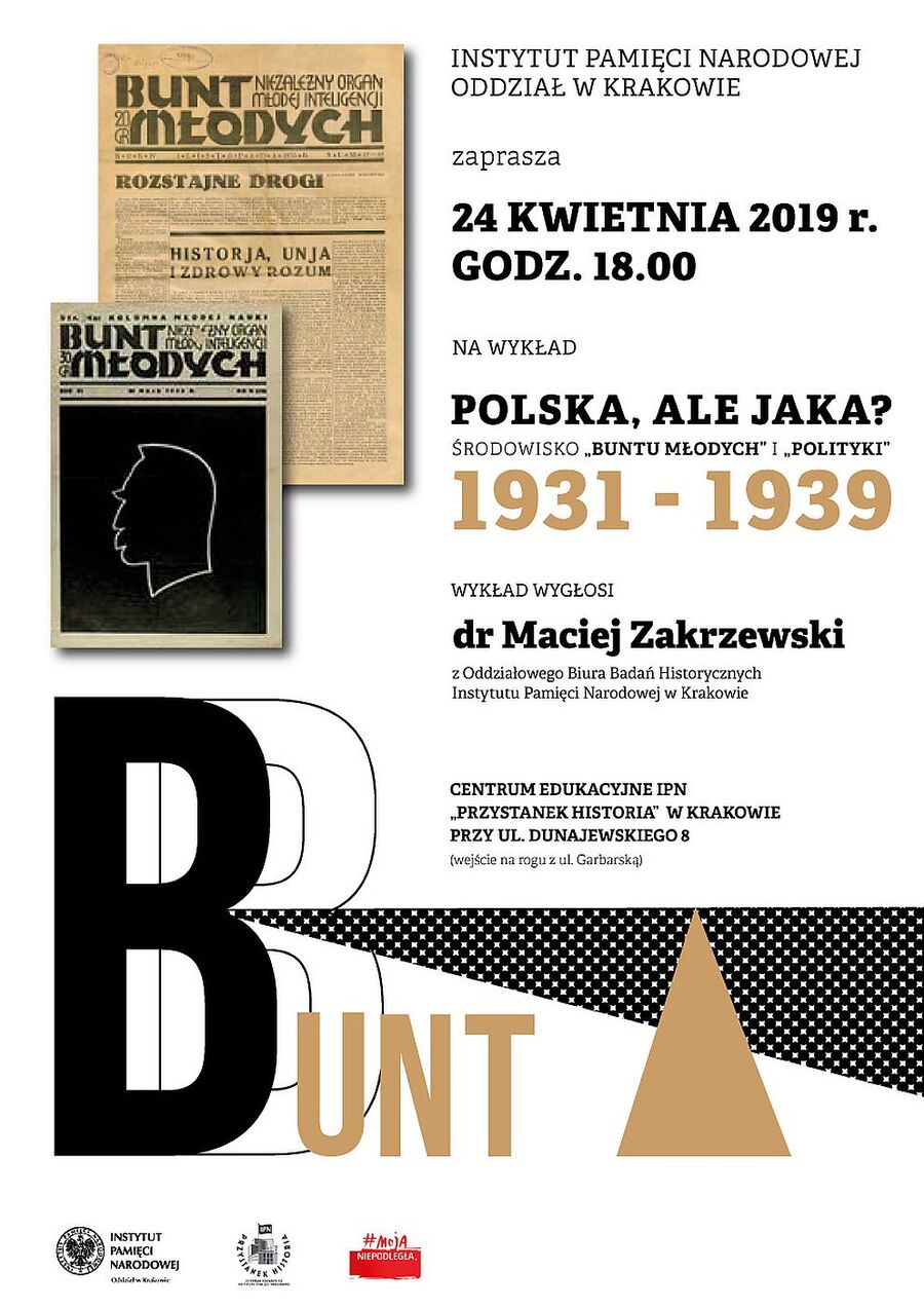 Polska, ale jaka? Środowisko „Buntu Młodych” i „Polityki” 1931-1939 – to tytuł wykładu, który wygłosi dr Maciej Zakrzewski z Oddziałowego Biura Badań Historycznych IPN w Krakowie. Zapraszamy na „Przystanek Historia” przy ul. Dunajewskiego 8 – 24 kwietnia 2019 r. o godz. 18.