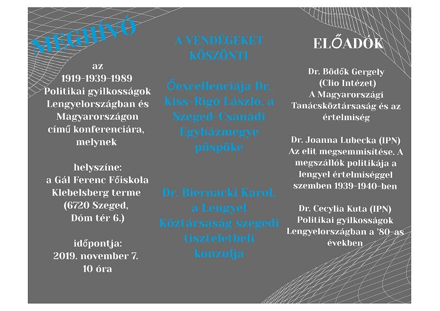 7 listopada 2019 r. w Segedynie (Węgry) odbędzie się międzynarodowa konferencja popularnonaukowa dotyczącą morderstw politycznych z lat  1919-1939-1989 w Polsce i na Węgrzech.