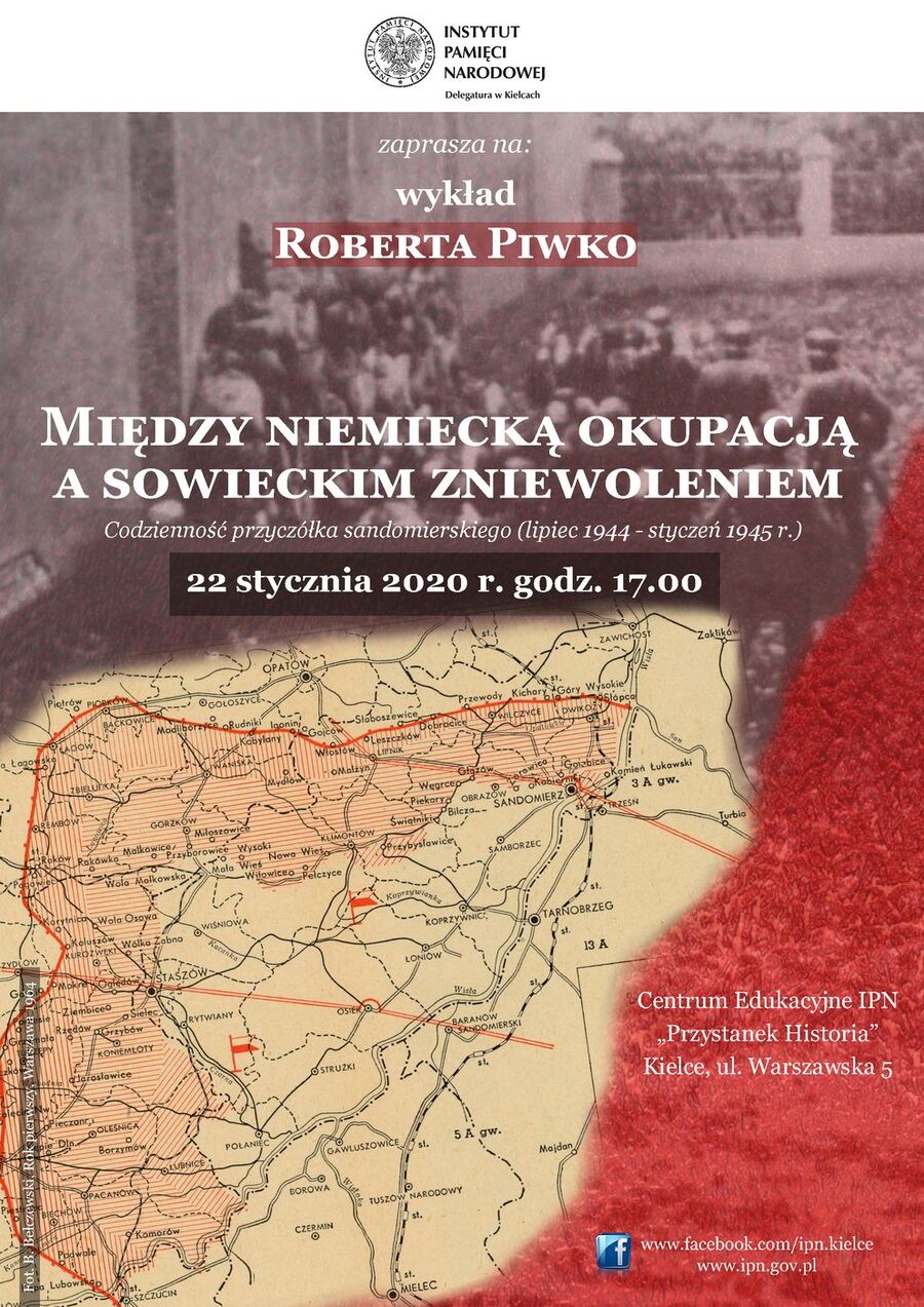 Robert Piwko z Biura Badań Historycznych kieleckiej delegatury IPN przybliży codzienność przyczółka sandomierskiego od lipca 1944 r. do stycznia 1945 r. Prelegent przedstawi przykłady represyjnej działalności funkcjonariuszy sowieckich i polskich organów bezpieczeństwa państwa, a także straty osobowe i rozmiary zniszczeń powiatów sandomierskiego, opatowskiego i stopnickiego. Ponadto omówione zostaną negatywne skutki stacjonowania żołnierzy Armii Czerwonej; zajmowanie budynków, nadmierna eksploatacja gospodarcza oraz przypadki przestępstw.