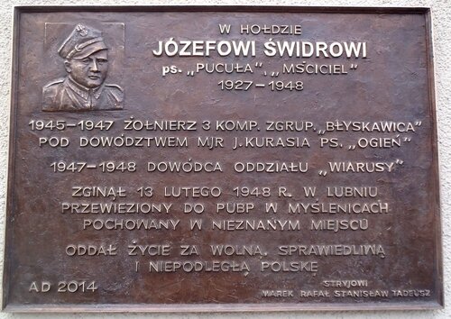 10/03/2014Odsłonięcie tablicy pamiątkowej poświęconej postaci Józefa Świdra „Mściciela” – twórcy i dowódcy oddziału partyzanckiego „Wiarusy” – Myślenice, 10 marca 2014