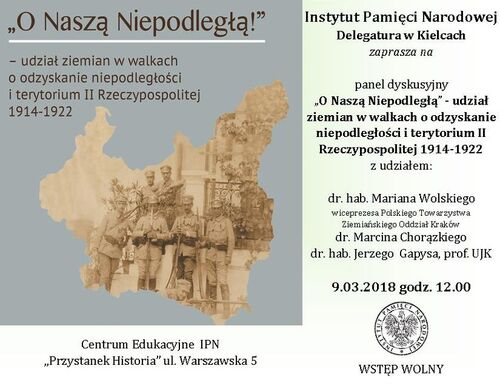 09/03/2018Panel dyskusyjny „O Naszą Niepodległą” – udział ziemian w walkach o odzyskanie niepodległości – Kielce, 9 marca