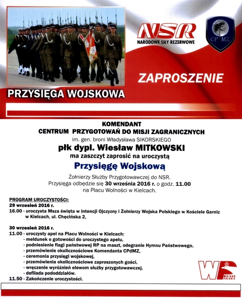 30/09/2016Uroczysta Przysięga Wojskowa Żołnierzy Służby Przygotowawczej do NSR – Centrum Przygotowań do Misji Zagranicznych – Kielce 30 września 2016