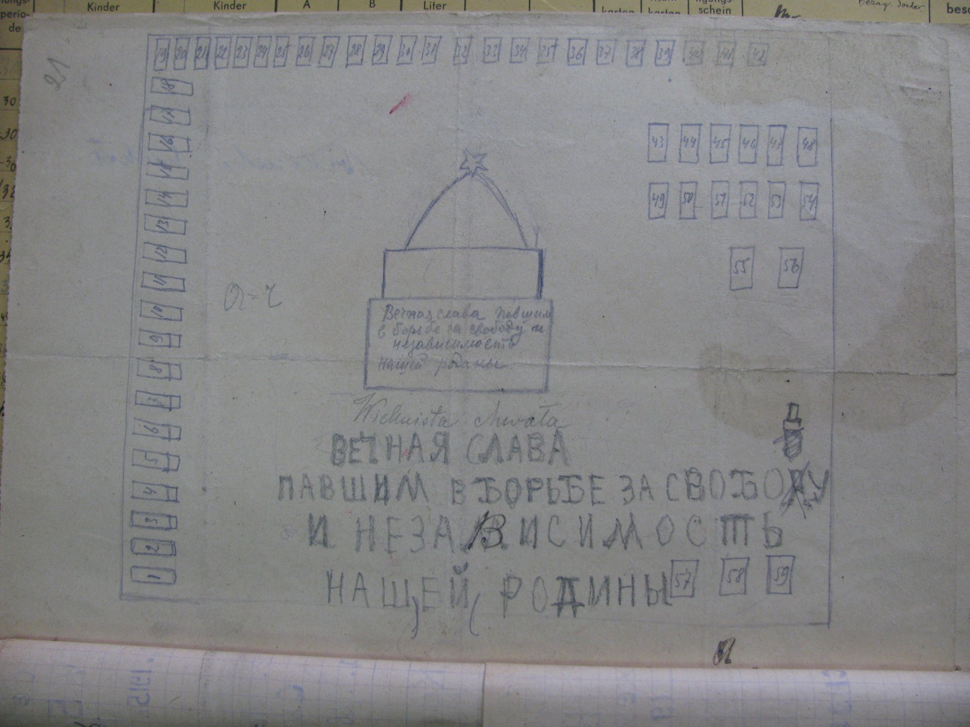 Odręczny szkic projektu sowieckiego cmentarza bohaterów w Szamotułach.Fot. ze zbiorów Archiwum Państwowego w Poznaniu.