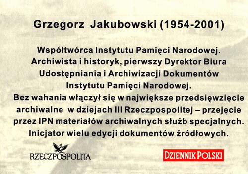 Dr Grzegorz Jakubowski (1954-2001) – był współzałożycielem Instytutu Pamięci Narodowej, pierwszym dyrektorem Biura Udostępniania i Archiwizacji Dokumentów Instytutu Pamięci Narodowej. Bez wahania włączył się w największe przedsięwzięcie archiwalne w dziejach III Rzeczypospolitej – przejęcie przez IPN materiałów archiwalnych służb specjalnych PRL. Zmarł 5 czerwca 2001 roku podczas pełnienia obowiązków służbowych.