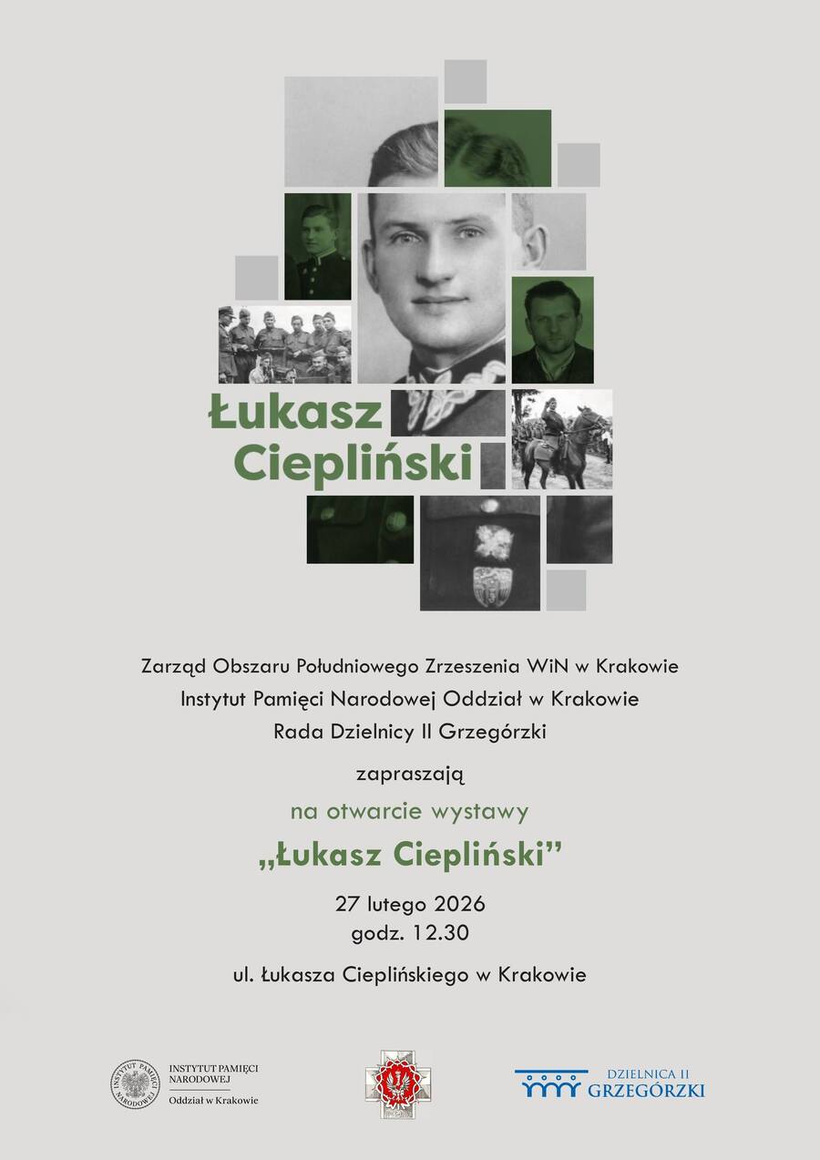 Zapraszamy na uroczystość otwarcia wystawy IPN „Łukasz Ciepliński”, poświęconej prezesowi IV Zarządu Zrzeszenia „Wolność i Niezawisłość”, zamordowanemu przez komunistów 1 marca 1951 r. Spotkanie odbędzie się na ul. Cieplińskiego w Krakowie, 27 lutego 2026 r. Początek o godz. 12.30.