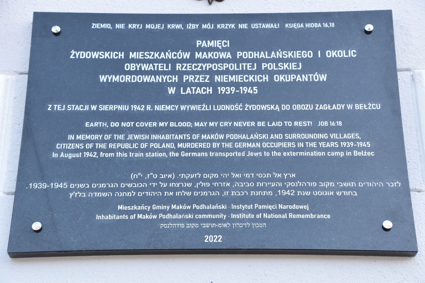 Tablica z wizerunkami orła państwowego i gwiazdy Dawida została umieszczona na budynku dworca, skąd w sierpniu 1942 r. Niemcy wywieźli przeważającą część żydowskiej społeczności Makowa do obozu zagłady w Bełżcu.