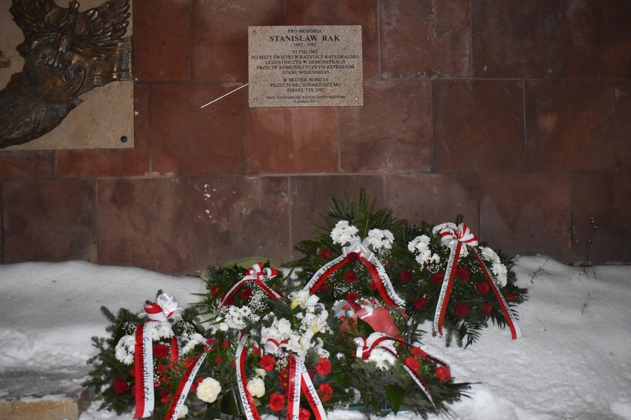 Podczas wieczornego spotkania przedstawiciele świętokrzyskiej „Solidarności”, władz i instytucji działających w Kielcach złożyli kwiaty przed tablicą znajdującą się na murze katedralnym, która upamiętnia Stanisława Raka, jedną z ofiar stanu wojennego. Był on 35-letnim zegarmistrzem, który brał udział w demonstracji pod kielecką katedrą 31 sierpnia 1982 r., czyli w trzecią rocznicę podpisania porozumień sierpniowych. Został zaatakowany przez oddziały ZOMO i pobity. Po kilku dniach zmarł.
