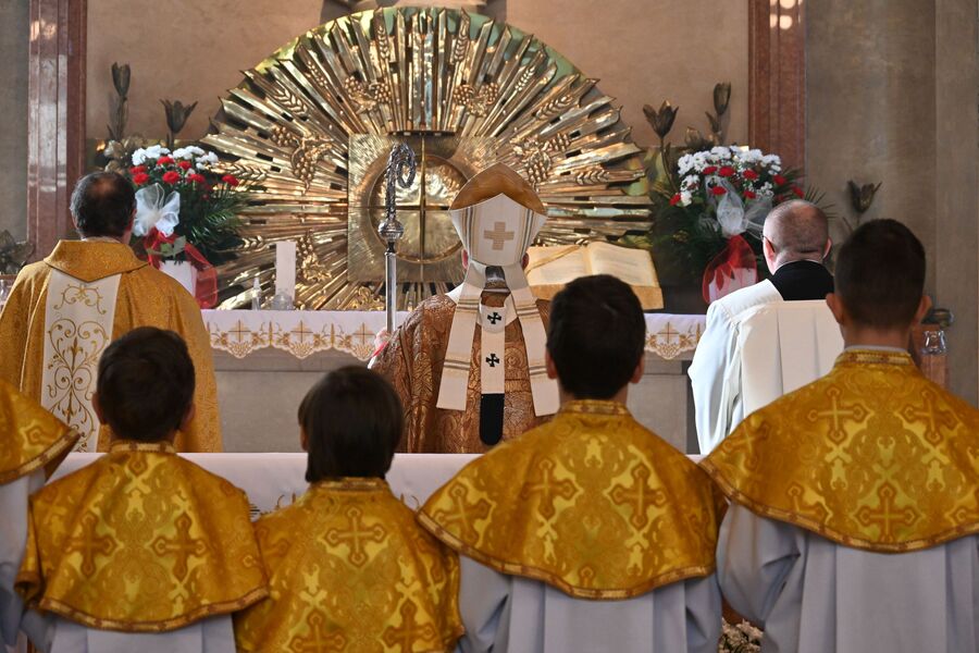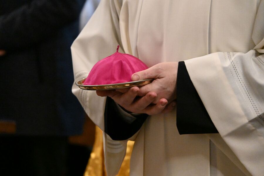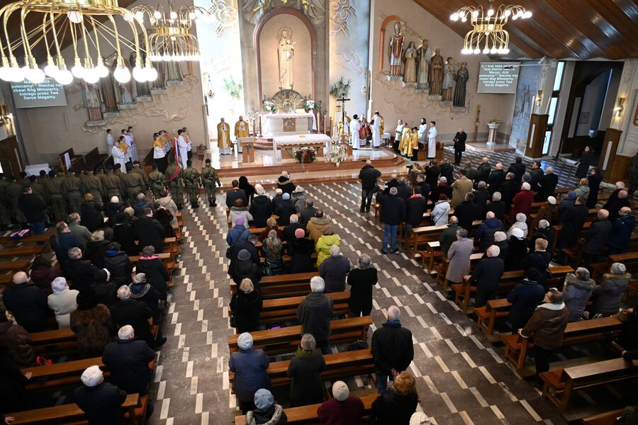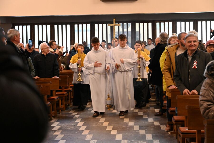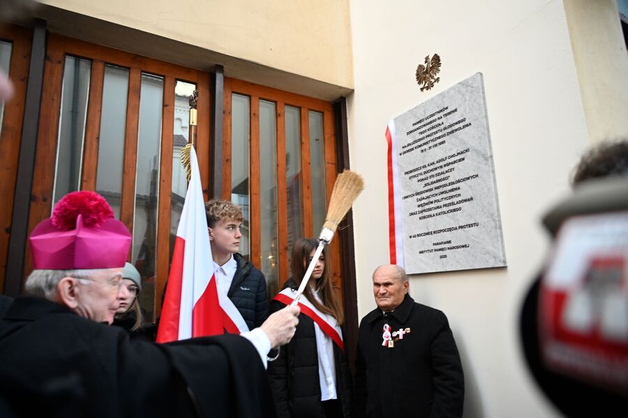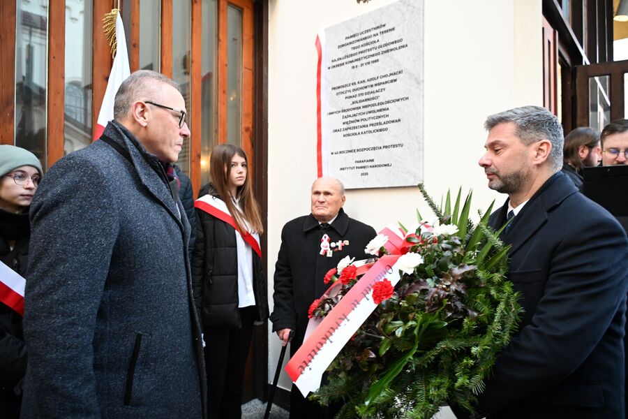 Następnie uczestnicy przeszli przed wejście do kościoła, gdzie abp Marek Jędraszewski poświęcił tablicę. Odsłonięcia upamiętnienia umieszczonego na elewacji świątyni dokonali reprezentujący uczestników głodówki Anna Pietras i Kazimierz Pająk oraz dr hab. Filip Musiał.