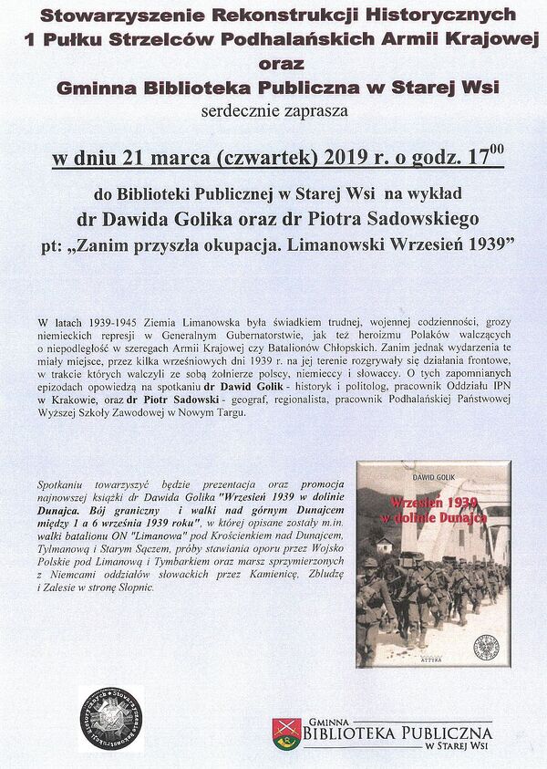O tym m.in. rozmawiano 20 marca 2019 r. w Centrum Edukacyjnym „Przystanek Historia” IPN w Krakowie, podczas marcowego spotkana Krakowskiej Loży Historii Współczesnej. Tematów do dyskusji dostarczyła najnowsza książka krakowskiego IPN, autorstwa dr. Dawida Golika, pt. „Wrzesień 1939 w dolinie Dunajca. Bój graniczny i walki nad górnym Dunajcem między 1 a 6 września 1939 roku”. Oprócz autora, gościliśmy dr. inż. arch. Krzysztofa Wielgusa, a całość poprowadził jak zwykle Roman Graczyk.