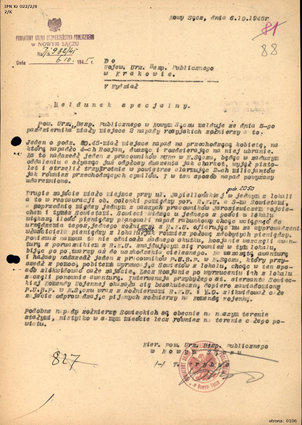 Nawet „interwencja przybyłego st. sierż. Sowieckiej Komendy Wojennej okazała się bezskuteczna”. Awanturujących się Sowietów okiełznali dopiero przybyli w większej liczbie funkcjonariusze PUBP w Nowym Sączy, żołnierze RKU i milicjanci. Jak podkreślał kierownik PUBP: „Podobne napady żołnierzy sowieckich są obecnie na naszym terenie stałymi, nie tylko w samym mieście, lecz również na terenie całego powiatu”. (IPN Kr 022/2, t. 8, Raporty i meldunki specjalne PUBP w Nowym Sączu z okresu od maja do grudnia 1945 r. dotyczące rozpracowywania członków oddziałów zbrojnych i nielegalnych organizacji działających na terenie pow. Nowy Sącz, k. 106, Meldunek specjalny kierownika PUBP w Nowym Sączu do Wydziału V WUBP w Krakowie, Nowy Sącz, 6 X 1945 r.).