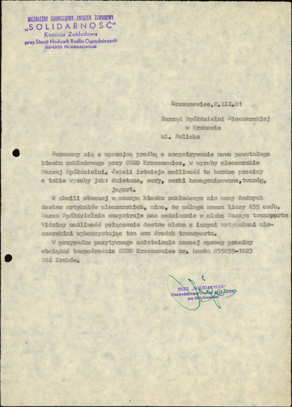 Warto również zwrócić uwagę na ciekawe dokumenty związane z działalnością związku, ukierunkowaną na poprawę warunków socjalno-bytowych pracowników. Jedną z ostatnich inicjatyw komisji zakładowej w tym zakresie było wystosowanie 2 grudnia 1981 r. pisma do Zarządu Spółdzielni Mleczarskiej w Krakowie z prośbą o zaopatrywanie nowo powstałego kiosku zakładowego przy SHRO w Krzeszowicach w wyroby mleczarskie: śmietanę, sery, serki homogenizowane, twaróg i inne. Jest to zarazem ostatni zachowany dokument z działalności KZ NSZZ „Solidarność” przy SHRO w Krzeszowicach przed wprowadzeniem stanu wojennego.