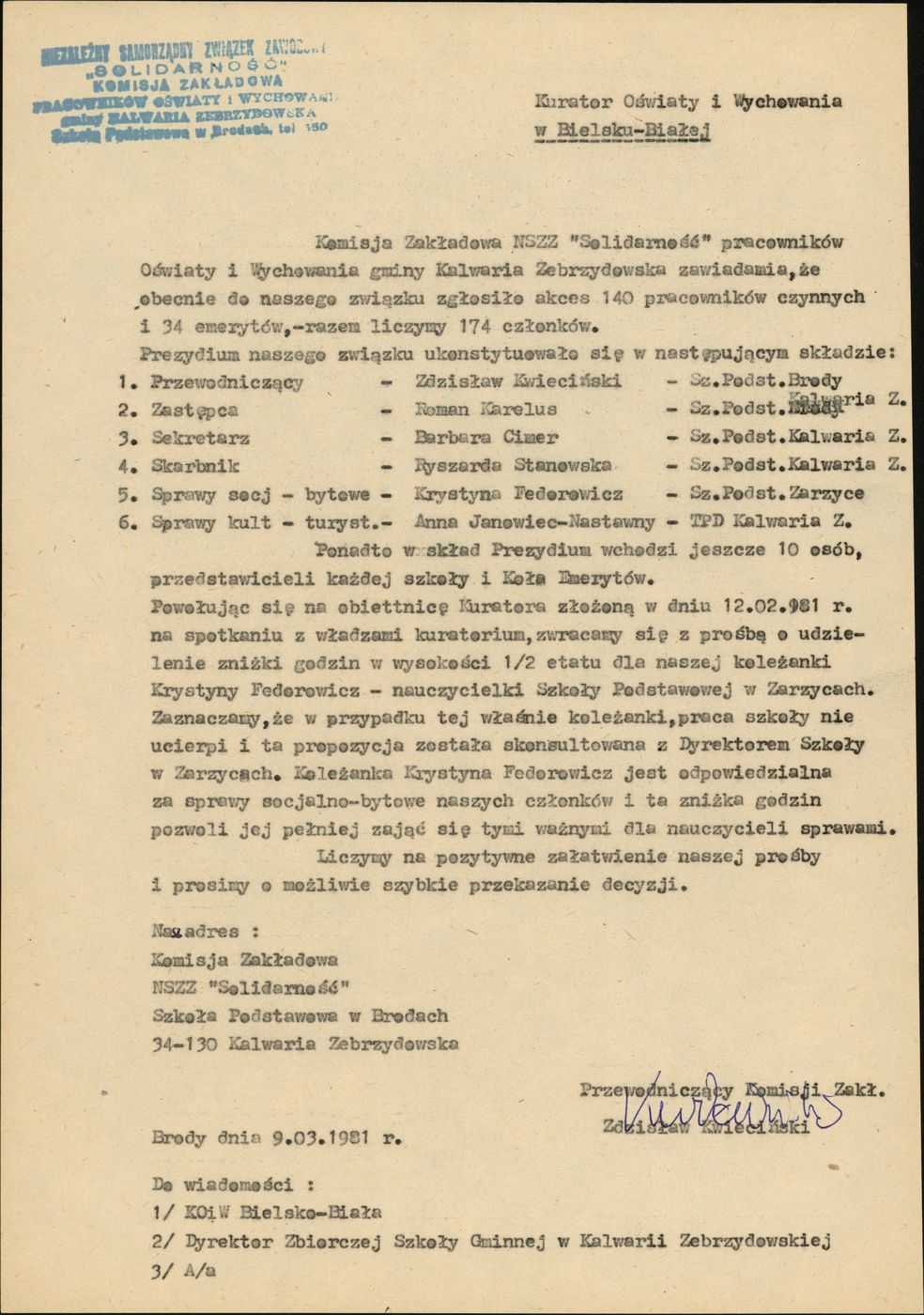 9 marca 1981 r. przewodniczący Komisji Zakładowej NSZZ „Solidarność” Pracowników Oświaty gminy Kalwaria Zebrzydowska zawiadomił Kuratora Oświaty i Wychowania w Bielsku-Białej o ukonstytuowaniu się prezydium komisji zakładowej w następującym składzie: Zdzisław Kwieciński (szkoła podstawowa w Brodach) – przewodniczący, Roman Karelus (szkoła podstawowa w Kalwarii Zebrzydowskiej) – zastępca przewodniczącego, Barbara Cimer (szkoła podstawowa w Kalwarii Zebrzydowskiej) – sekretarz. Po blisko 40 latach od tego wydarzenia Zdzisław Kwieciński zdecydował o przekazaniu do IPN w Krakowie zgromadzonych przez siebie materiałów po działalności komisji.