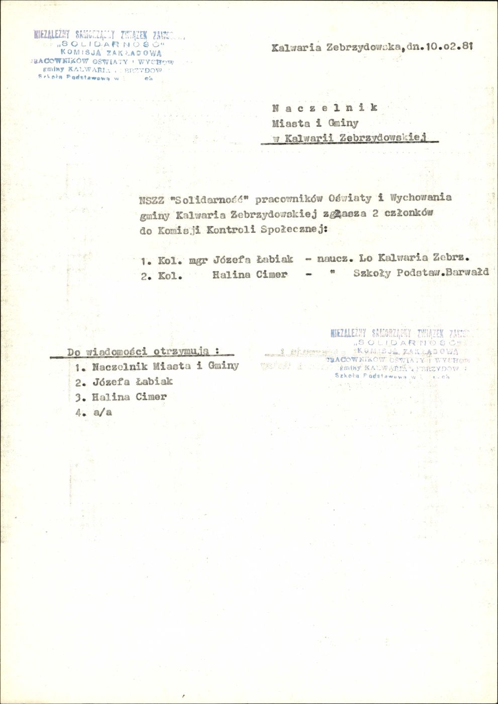 „Rada Zakładowa ZNP (...) nie wyraża ochoty na rozmowy z naszą Komisją Zakładową” – KZ NSZZ „Solidarność” Pracowników Oświaty i Wychowania gminy Kalwaria Zebrzydowska