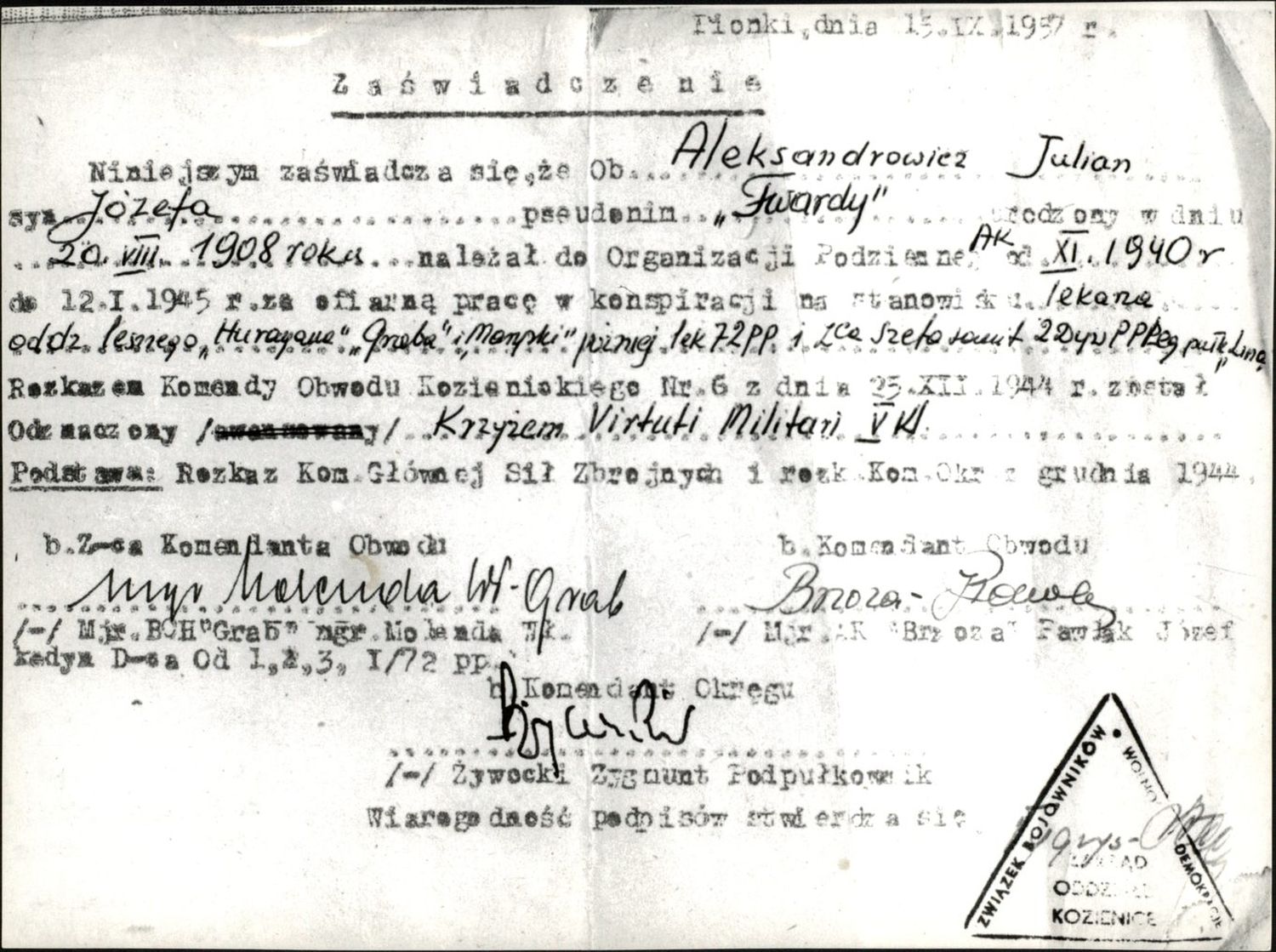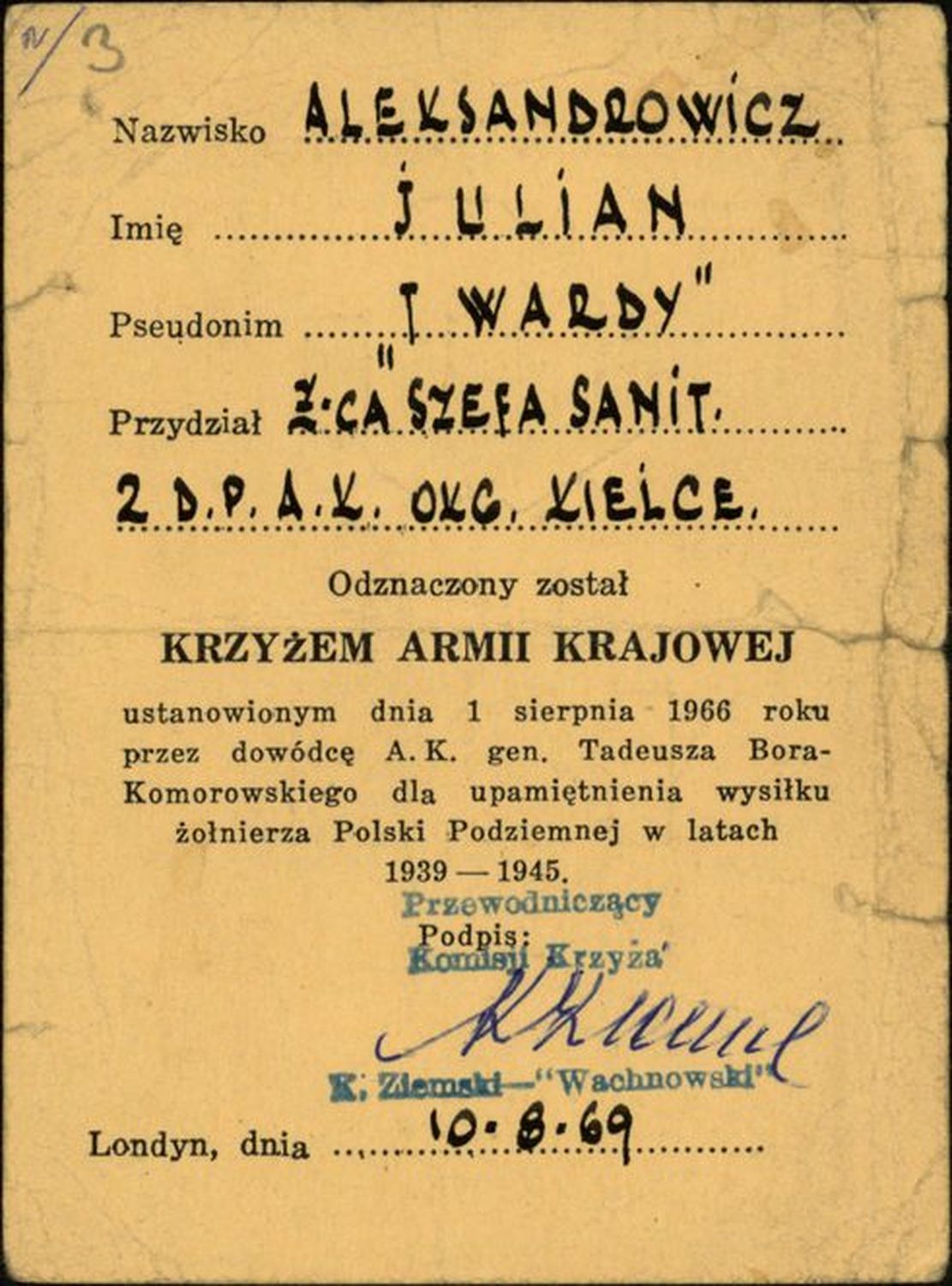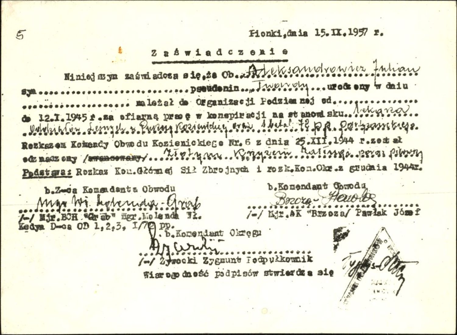 Jeden z fałszywych dokumentów Juliana Aleksandrowicza (1944). Dok. ze zbiorów IPN -