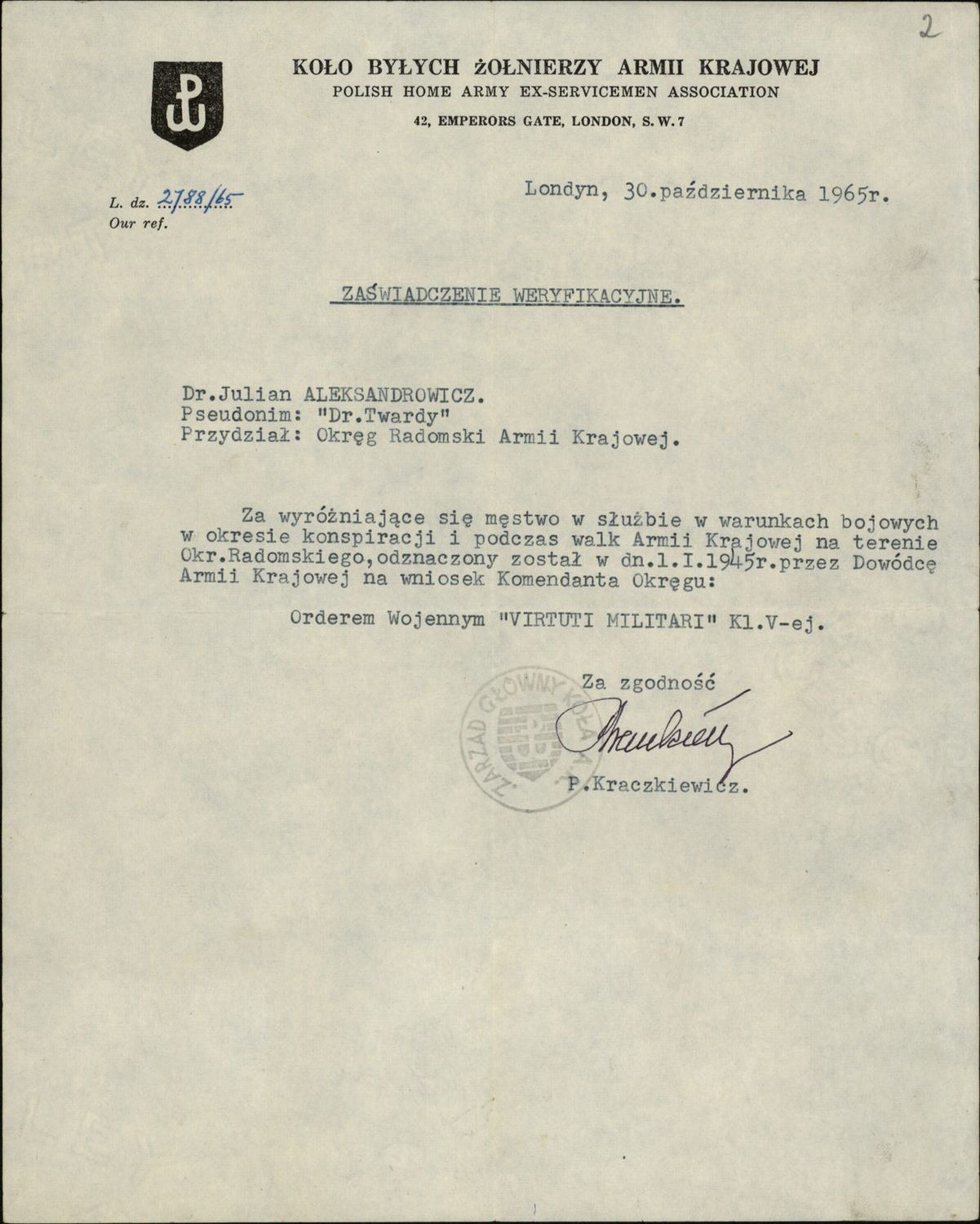 Wykorzystując wyjazdy zagraniczne związane z prowadzoną przez siebie działalnością naukową, w latach 60. nawiązał kontakt z rezydującymi w Londynie polskimi władzami emigracyjnymi i uzyskał potwierdzenie nadania Orderu Wojennego Virtuti Militari klasy V (nr 13019). W 1969 r. odznaczony został ustanowionym w 1966 r. Krzyżem Armii Krajowej (nr 5890), nieuznawanym w PRL.