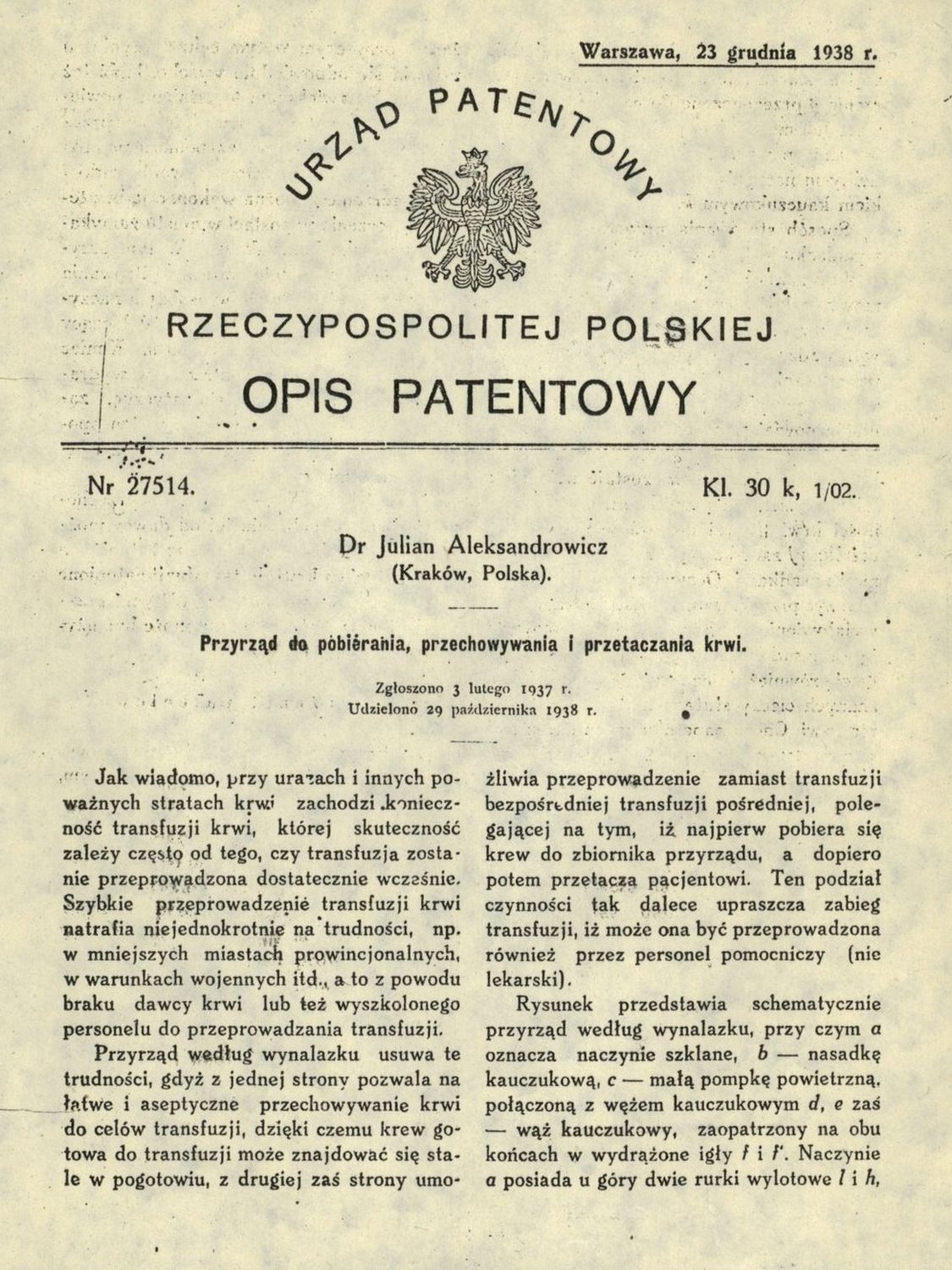 Patent Juliana Aleksandrowicza na przyrząd do transfuzji krwi. Dok. ze zbiorów IPN -
