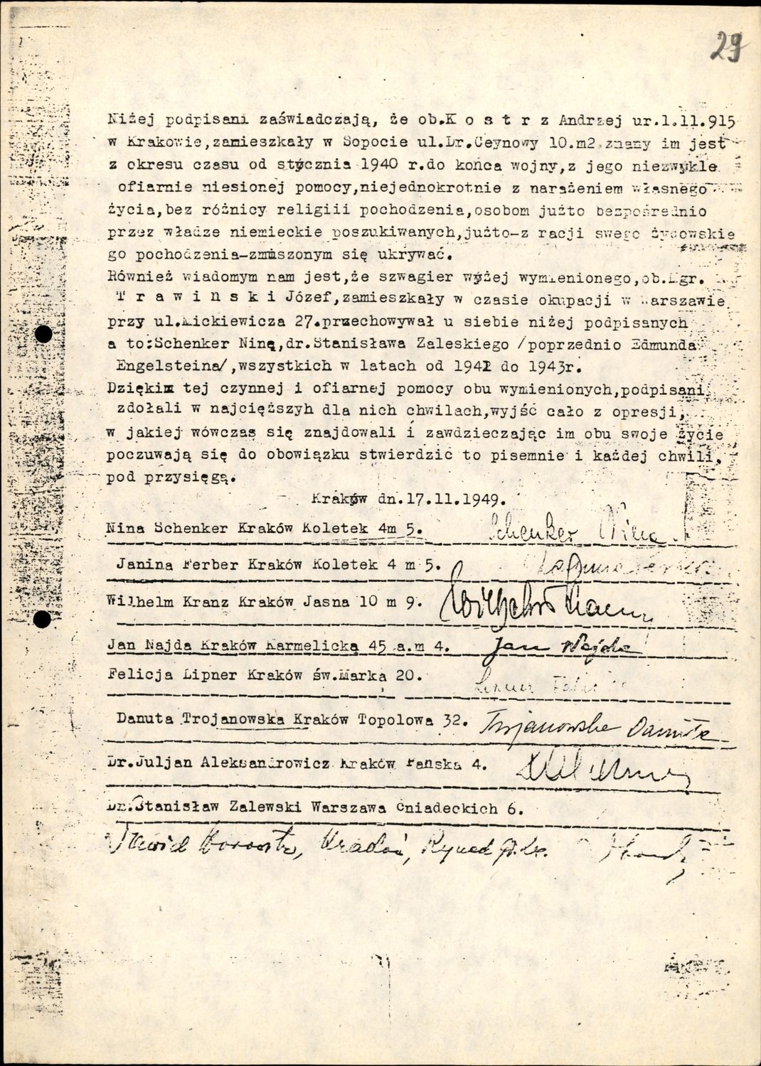 Najstarsze znane świadectwo Julian Aleksandrowicza, poświadczające udzielanie pomocy Żydom. Dok. ze zbiorów IPN -