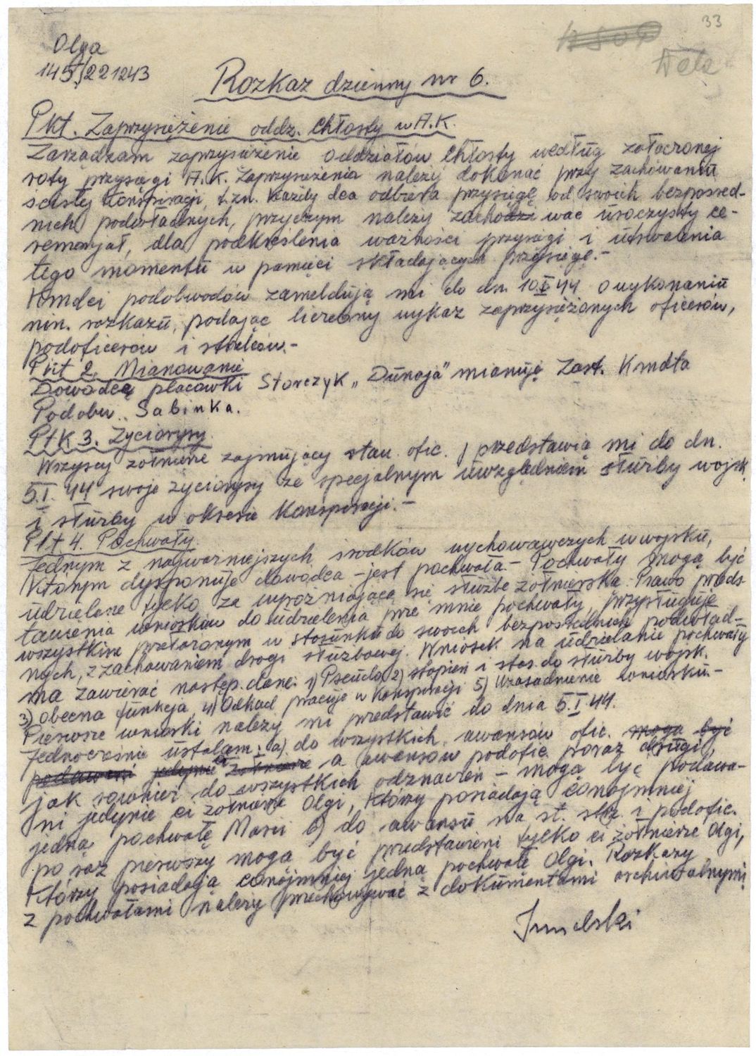 Rozkaz pochodzący ze zbioru dokumentów sztabowych 116 Pułku Piechoty AK Ziemi Olkuskiej kryptonim „Winiarnia”, przekazanych do IPN w Krakowie przez Michała i Krzysztofa Ostrowskich