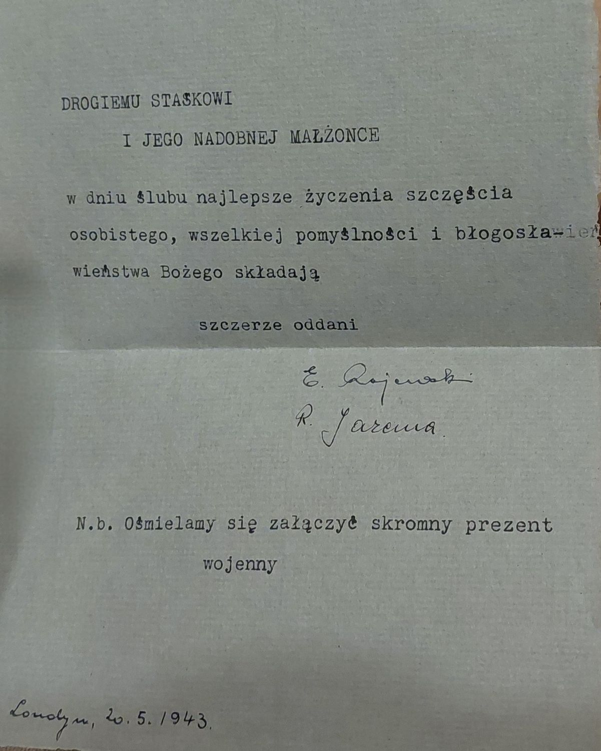 W rodzinnym archiwum zachowała się kartka z życzeniami, które nowożeńcy dostali od przyjaciół Stanisława, polskich pilotów – por. Eugeniusza Rajewskiego i por. Romana Jaremy. Jeden z nich – Eugeniusz Rajewski – zginął niedługo później, podczas pozorowanej walki 27 grudnia 1943 r.