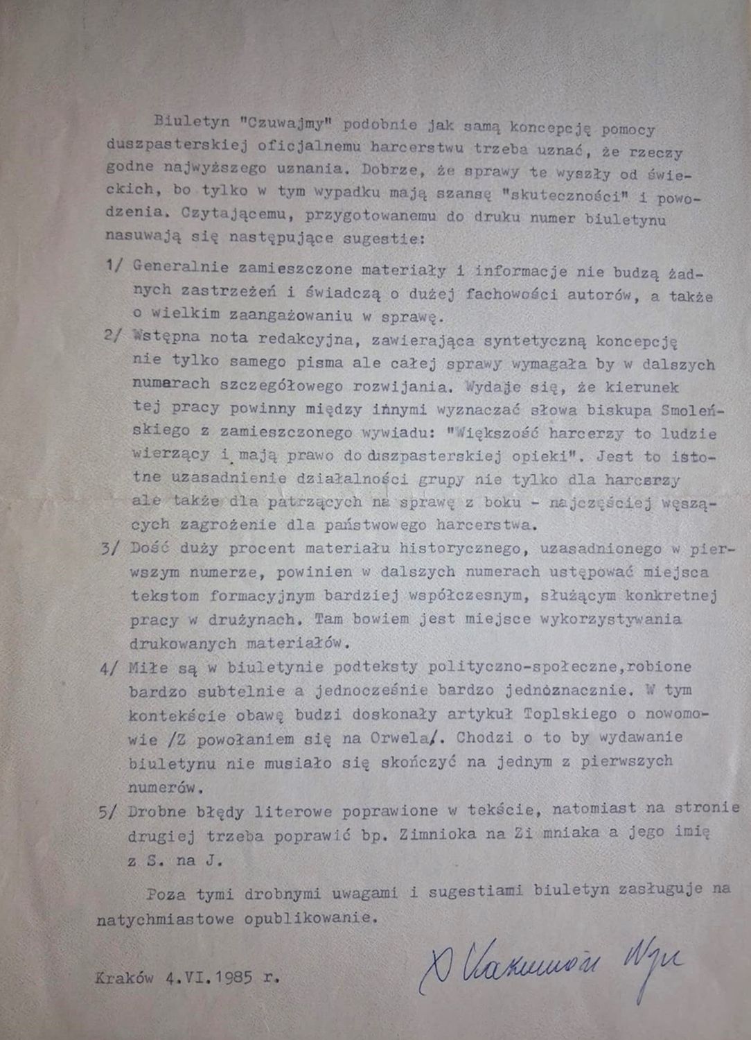 Przez wszystkie lata opiekunem duszpasterskim czasopisma był ks. phm. Ryszard Honkisz. Warto zasygnalizować, że ukazanie się pierwszego numeru poprzedziła analiza maszynopisu, przeprowadzona przez ks. Kazimierza Nycza i jego pozytywna opinia. Została ona pisemnie sformalizowana 4 czerwca 1985 r.