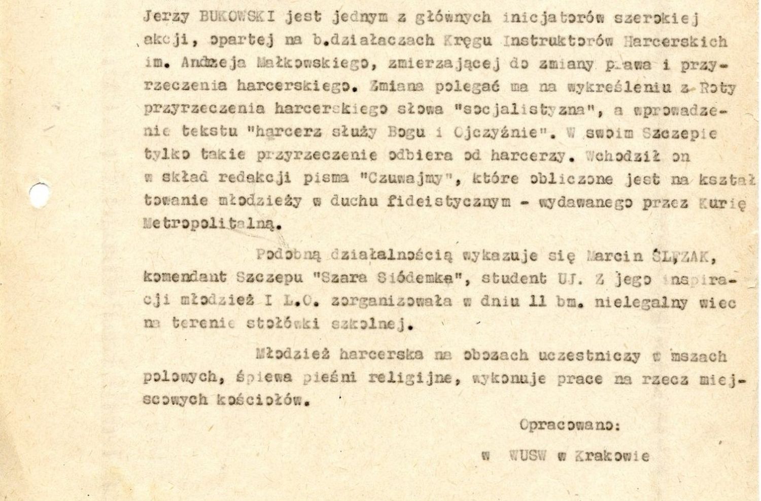 Bezpieka miała świadomość, że ma ono zasięg ogólnopolski, jest wydawane w Krakowie, w jego tworzeniu uczestniczą korespondenci z innych stron kraju. Błędnie natomiast określano krąg osób je redagujących, m.in. przypisując udział w pracach kapelanowi harcerskiemu o. Adamowi Studzińskiemu OP, hm. Ryszardowi Wcisło czy hm. Wiesławie Stojek. Wymieniano w raportach i analizach obok danych osób istniejących nazwiska będące pseudonimami. Można odnieść wrażenie, że osoby najbardziej aktywne w krakowskim duszpasterstwie harcerskim utożsamiano z redakcją czasopisma.