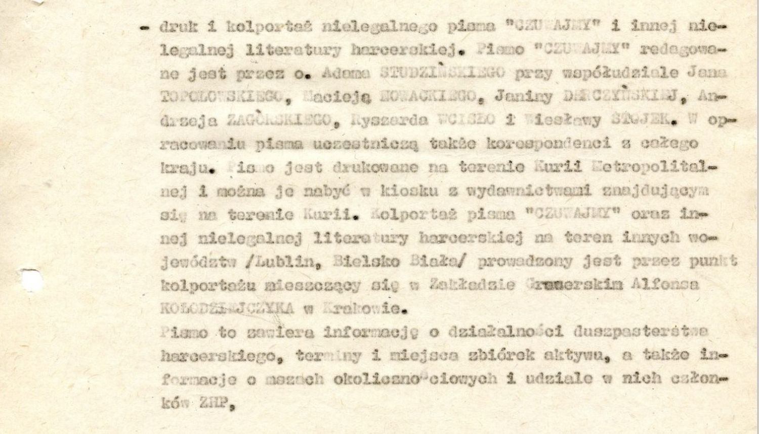 Bezpieka ponadto mylnie twierdziła, że druk odbywał się na terenie krakowskiej kurii. Z informacji, które uzyskałem od W. Hausnera wynika, że co najmniej do 1987 r. odbywał się on w zakonspirowanej formie w jednej z krakowskich oficjalnych drukarni. Wiedzę, gdzie dokładnie, posiadał jedynie redaktor naczelny, który z wiadomych przyczyn nie dzielił się nią z innymi osobami. Sądzę, że bezpieka przez pierwsze dwa, może trzy lata nie ustaliła faktycznego miejsca, w którym czasopismo powstawało.